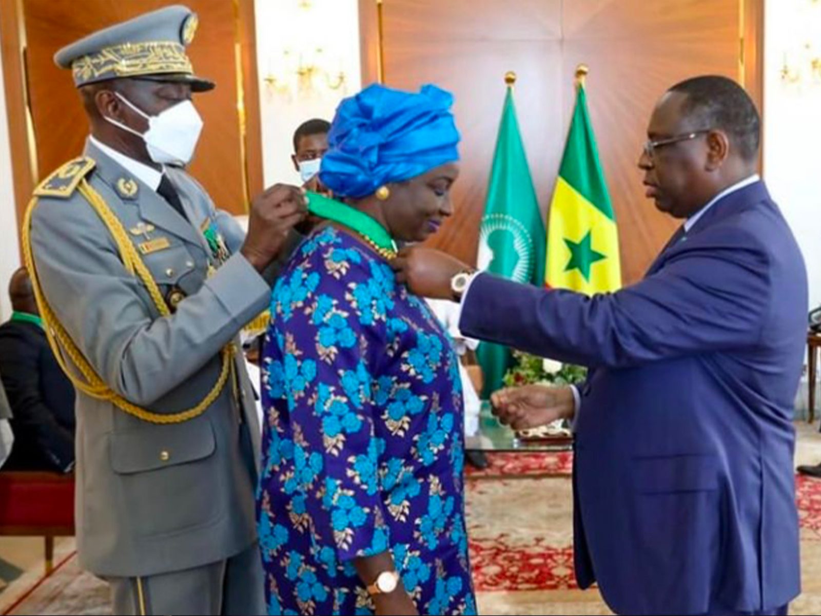Légende : L’ancienne Première ministre Aminata Touré et le Président Macky Sall de la République du Sénégal lors de la décoration de dignitaires politiques emblématiques.