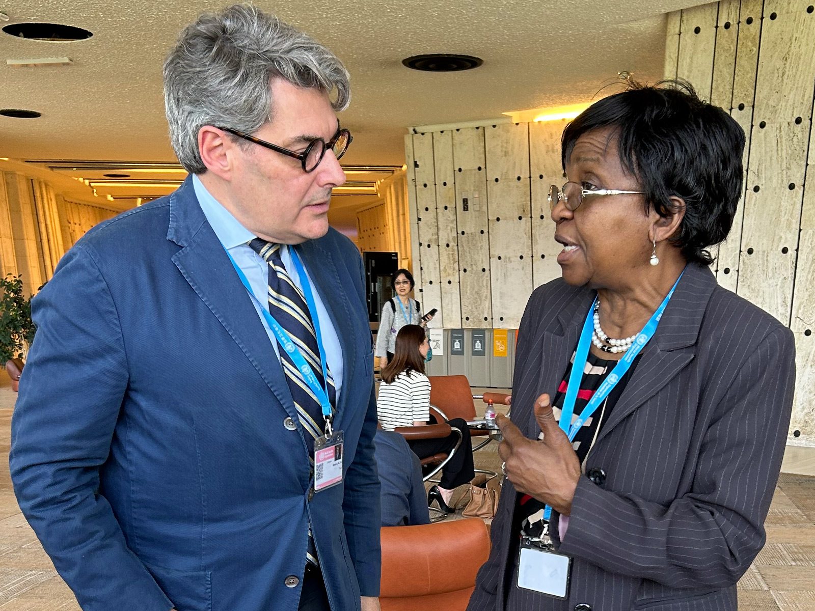 Le professeur Moji Christianah Adeyeye, Directrice générale de l’Agence nationale pour l’administration et le contrôle des aliments et des médicaments du Nigéria (NAFDAC) et M. Richard Amalvy, Directeur général de la Fondation Brazzaville, durant l’Assemblée mondiale de la Santé à Genève, © Fondation Brazzaville.