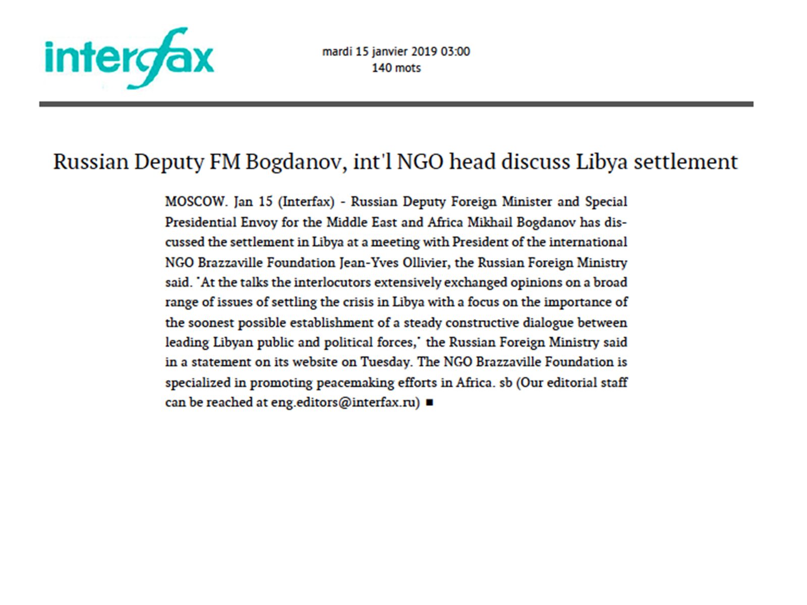 Le 15 janvier 2019, le Président de la Fondation Brazzaville a eu l’honneur de rencontrer le Représentant Spécial du Président de la Fédération de Russie pour le Moyen Orient et Vice-Ministre russe des Affaires étrangères. Le but de cette rencontre a été de discuter ensemble des efforts à mettre en oeuvre pour une paix durable en Libye.